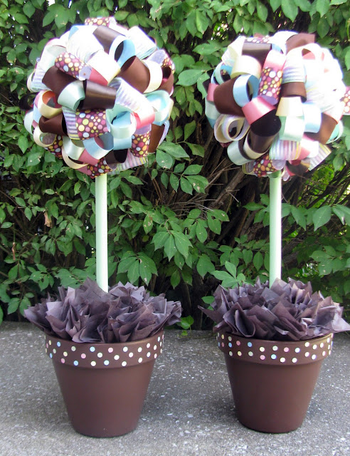 Another Mikaelah project: Have you seen some of the ribbon topiaries she has made for previous parties? Well, these are the baby version of them, and they're simply adorable. Some of the larger topiaries can be found